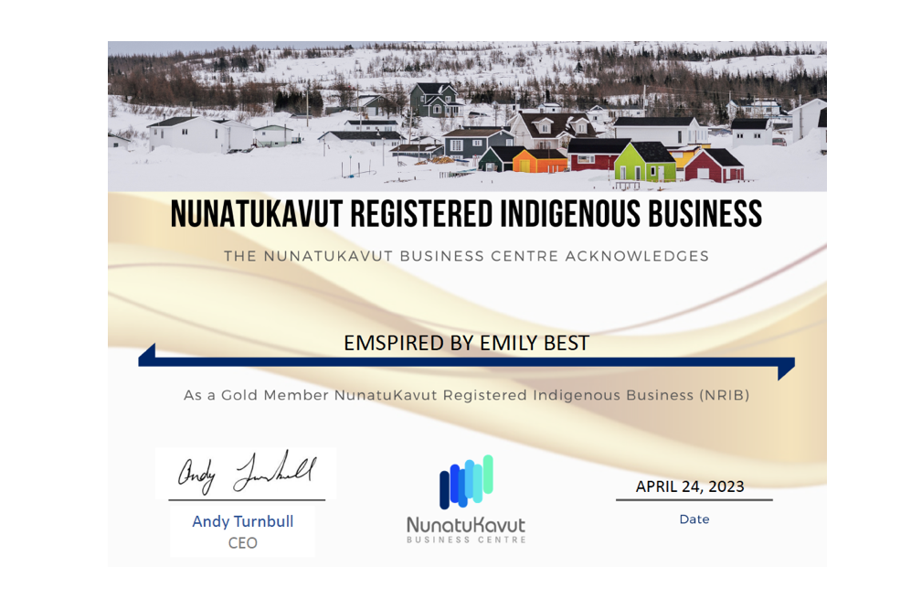 Emily Best is a proud member of the NunatuKavut Commnity Council, the representative governing body of the Southern Inuit of Labrador. Emspired is a Gold Member of the NunatuKavut Business Centre's business registry.